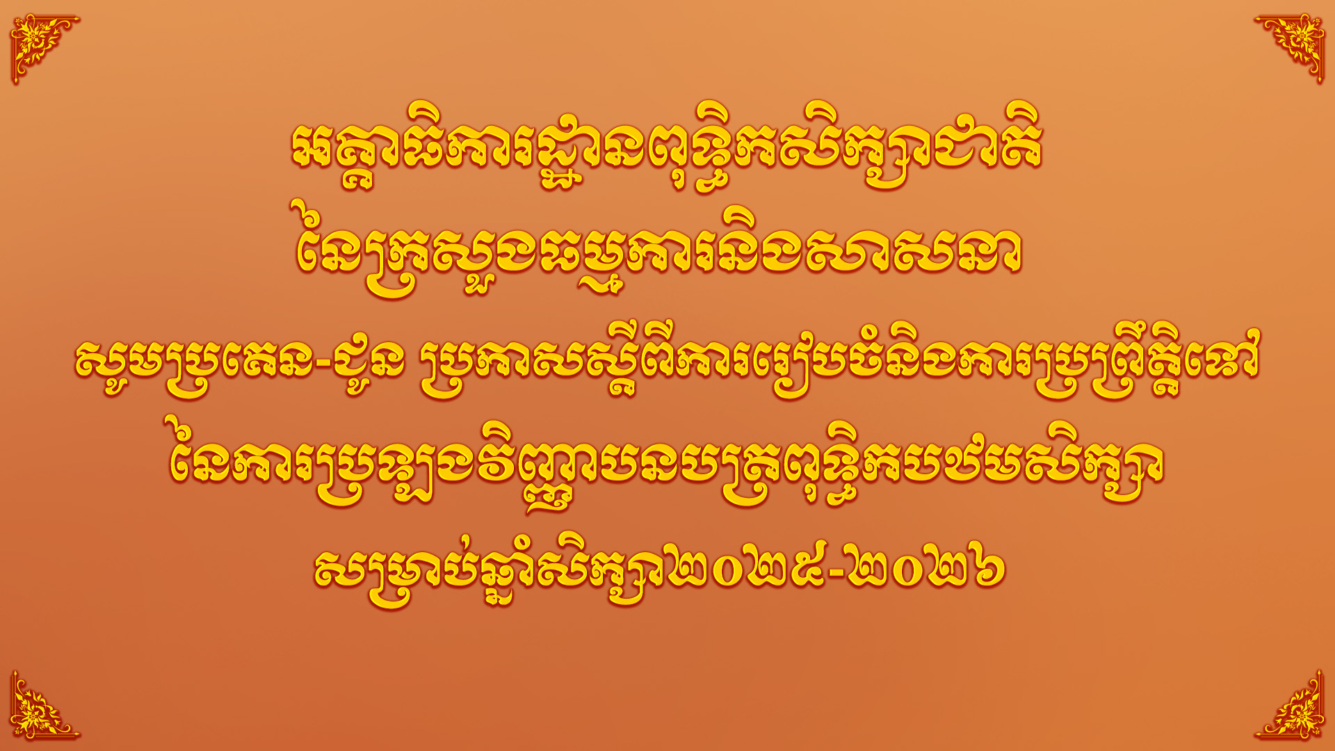 ប្រគេន-ជូន ប្រកាសស្តីពីការរៀបចំនិងការប្រព្រឹត្តិទៅ នៃប្រឡងវិញ្ញាបនបត្រពុទ្ធិកបឋមសិក្សា សម្រាប់ឆ្នាំសិក្សា២០២៥-២០២៦